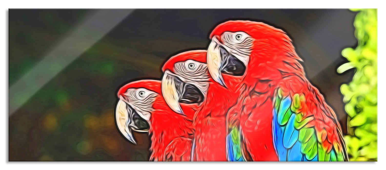 Produktcode: Bunte Papageien auf Ast, Glasbild Panorama