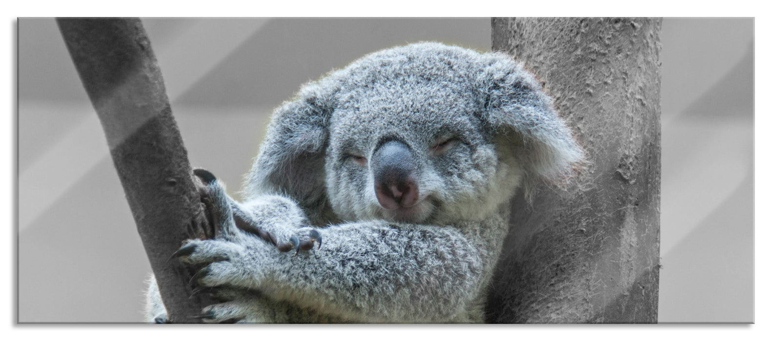 Produktcode: Schlafender Koala im Baum B&W Detail, Glasbild Panorama