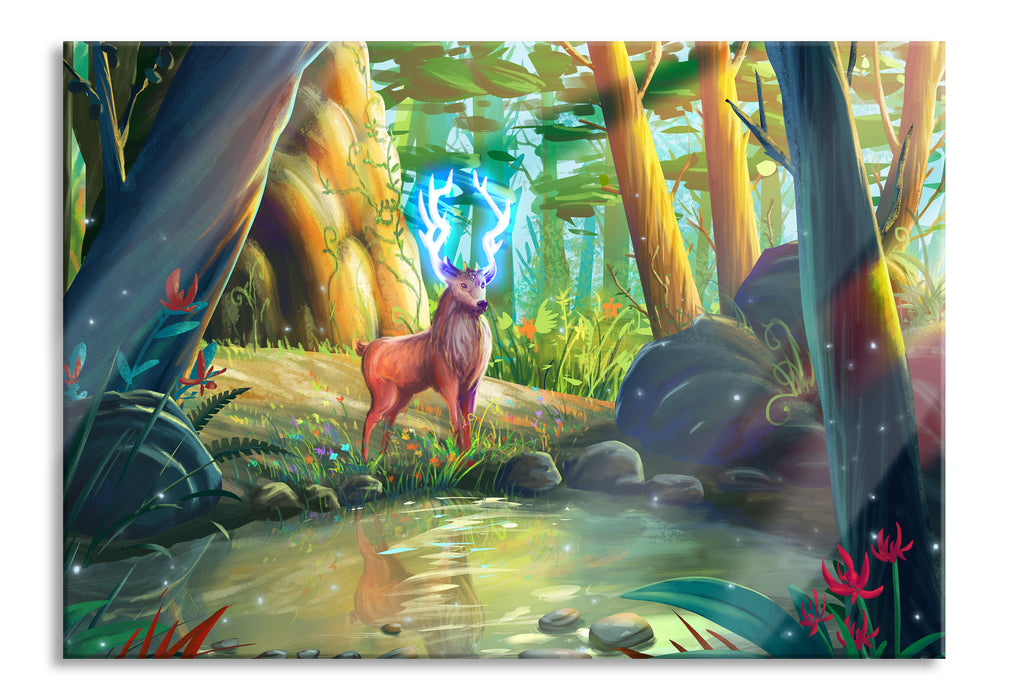 Produktnummer: Pixxprint Märchenhafter Hirsch an buntem Waldsee, Glasbild