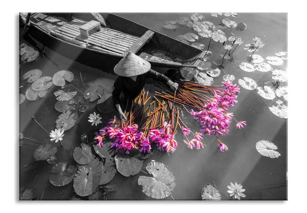 Haushalt / Pixxprint / Pixxprint Wasserlilienernte mit Boot in Vietnam B&W Detail, Glasbild verkäufe