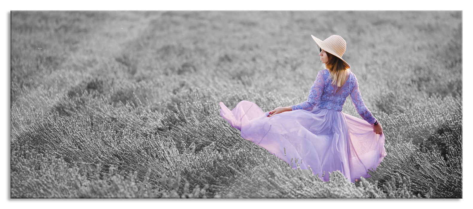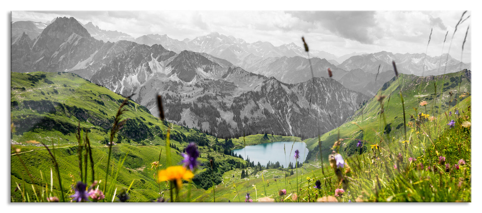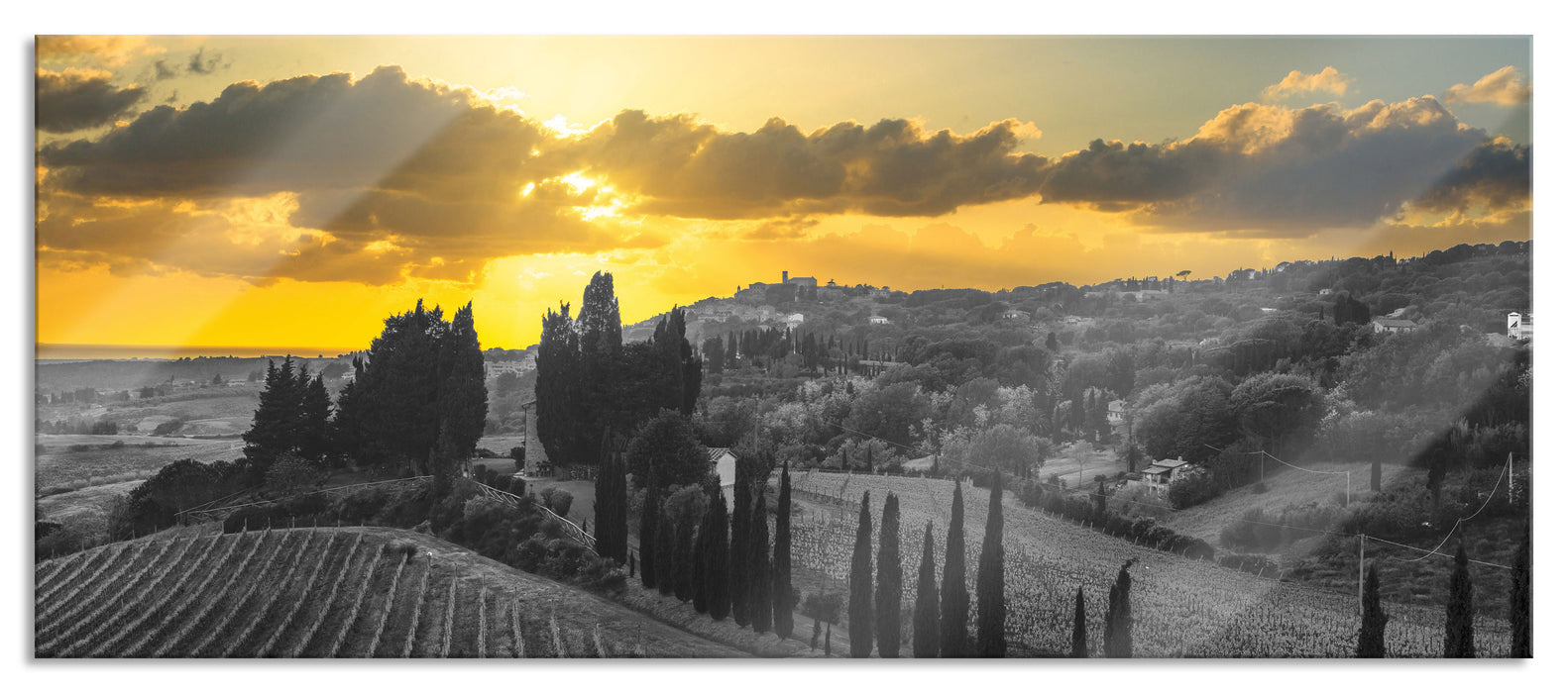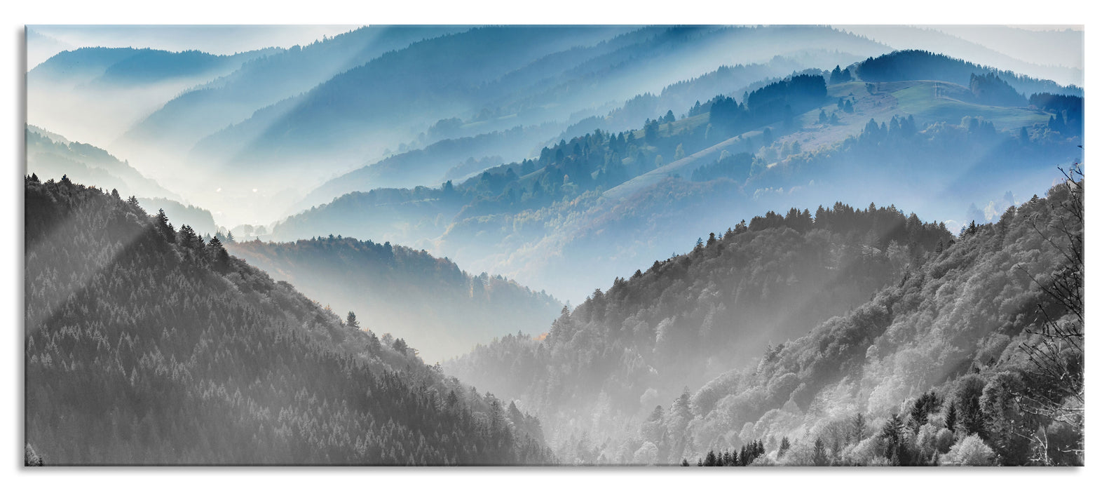 Produktcode: Nebelige Berglandschaft im Herbst B&W Detail, Glasbild Panorama