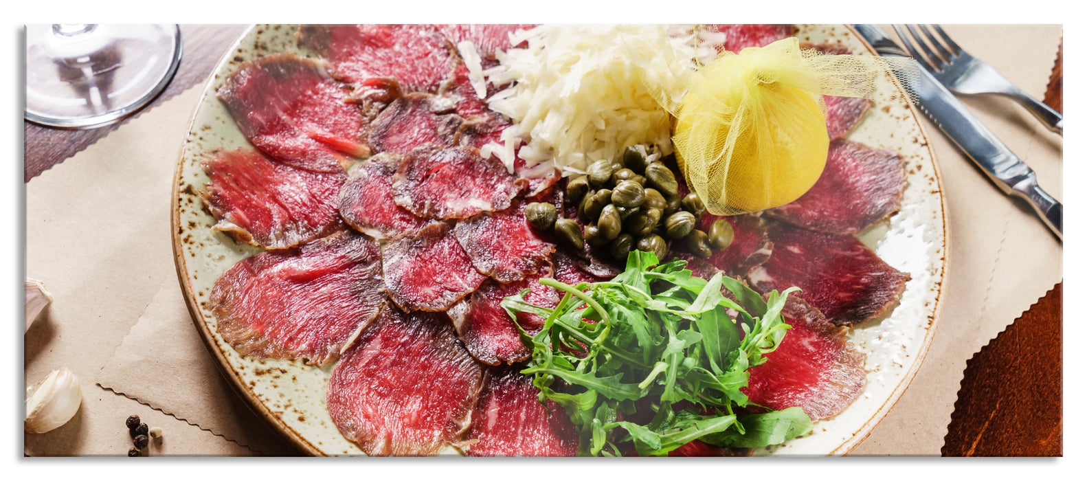 Produktcode: appetitliches Carpaccio, Glasbild Panorama